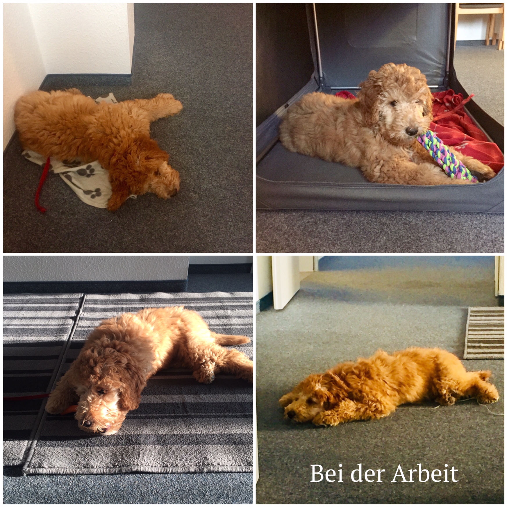 In der Woche begleite ich Frauchen zur Arbeit in die Erziehungsberatungsstelle. Ich verstehe das Wort Arbeit nicht so richtig, denn eigentlich ist es wie zu Hause. Ich liege viel rum und schlafe, zwischendurch geht es nach draußen und es wird auch gespielt. Die Frau von der Frauchen sagt, sie sei die Chefin, gibt mir jeden Tag eine Möhre, das finde ich großartig. Und die andere Frau im Sekretariat freut sich auch immer, mich zu sehen. Wenn einer von der Arbeit gestresst ist, gehe ich mal vorbei und lasse mich streicheln, dann ist die Laune gleich besser.
