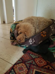 Camilla hat ständig neue Idee. Sie liebt es, in Baja’s Körbchen zu schlafen. Mittlerweile hat sie den Boden herausgeknabbert und schleppt es jetzt ständig durch die Wohnung.