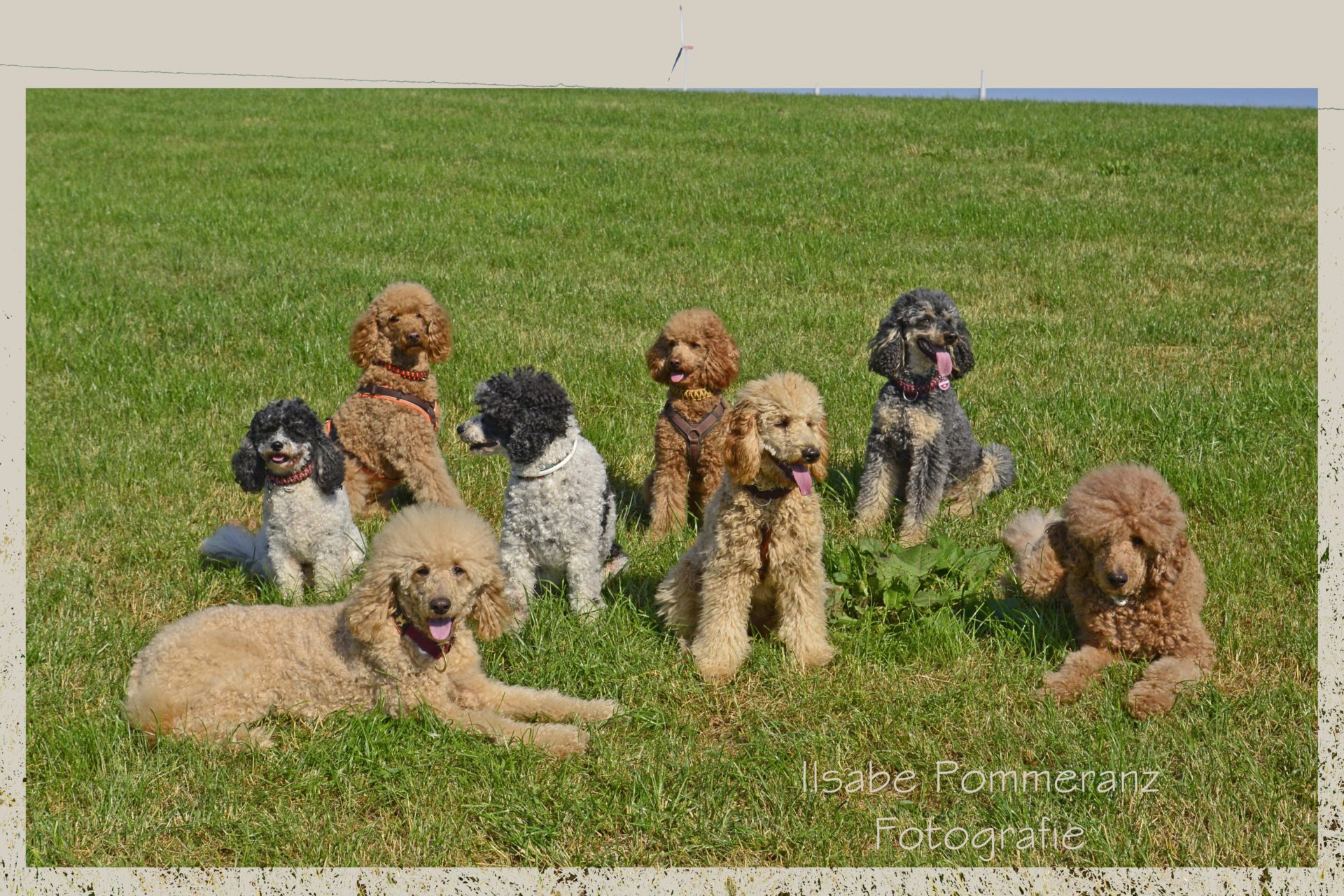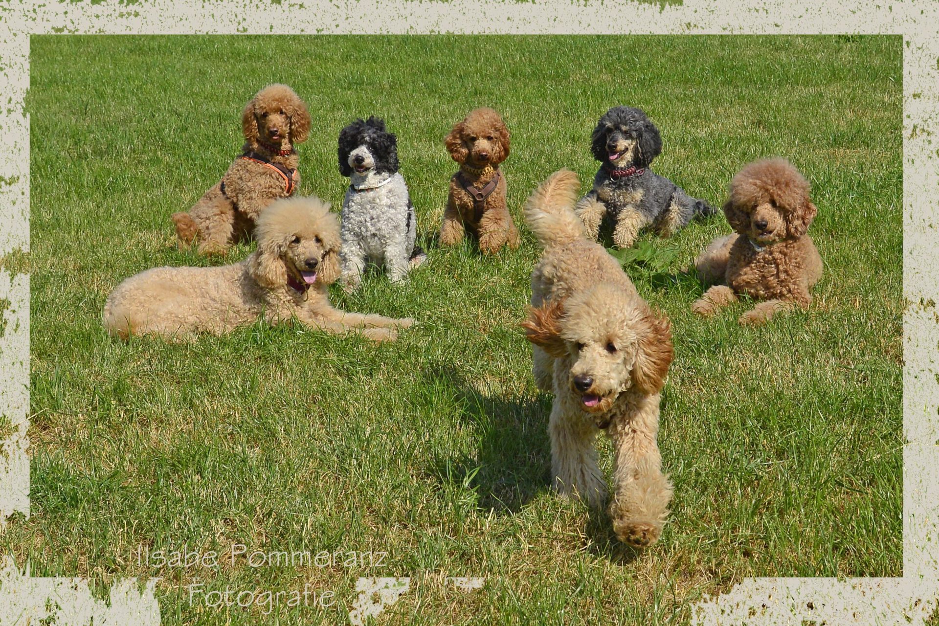 Es ist schon ein Vergnügen, wenn wir drei Pudelfrauen spazieren gehen. Insgesamt haben wir dann 8 Pudel. Alle laufen um uns rum und keiner ärgert den anderen. Man merkt gar nicht, dass es so viele Hunde sind. Nur das Durchzählen ist etwas schwer, weil 5 Hunde apricot sind und sich von weitem doch recht ähnlich sehen. Auf jeden Fall macht es den Hunden und uns ganz viel Spaß, über die abgemähten Wiesen zu toben.