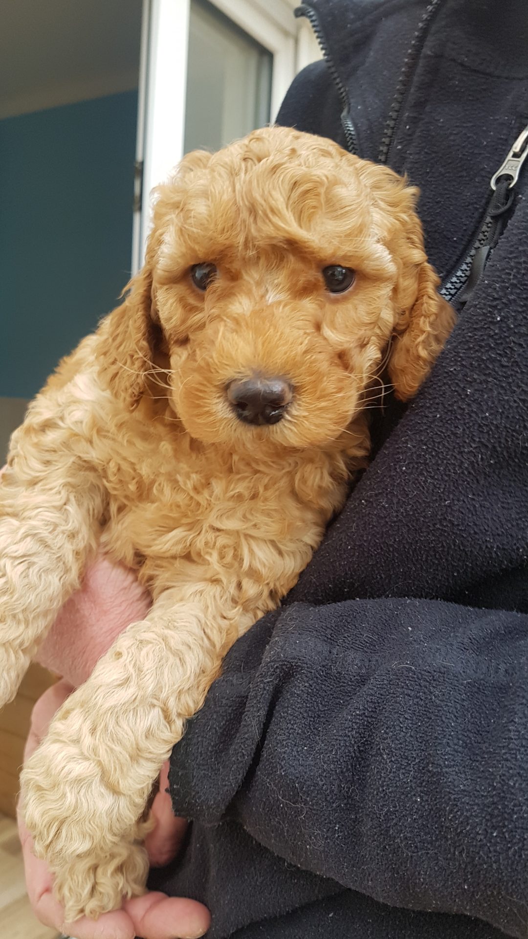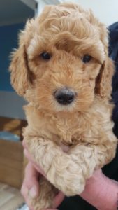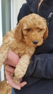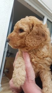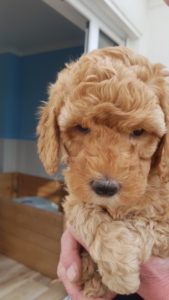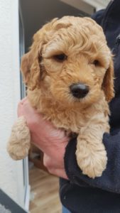 Das rote Mädchen war anfangs eher zurückhaltend. Jetzt bleibt sie häufig am längsten draußen und spielt häufig wild mit dem grünen Jungen. Sie hat einen zierlichen Kopf und ist die leichteste im Wurf.