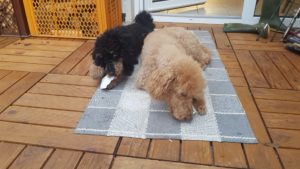 Es gab jetzt für alle eine Knabberei und Pepe hat sich einfach neben Julie gelegt und geknabbert. Julie ist ganz entspannt.