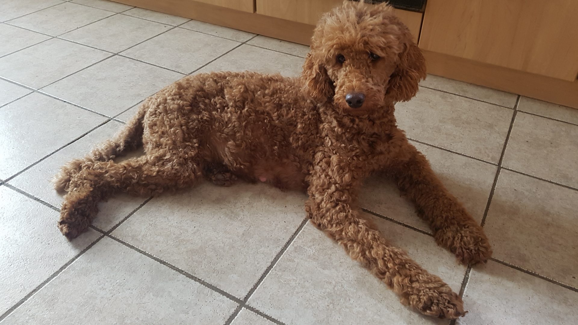 Jetzt heißt es nur noch abwarten und staunen, was sich im Bauch tut. Bald kann man Welpenbewegungen spüren und fühlt auch, wenn sich der Kopf oder Po der Welpen gegen Julchens Bauch drückt. Aber noch ist genug Platz und ich kann nur den dicken Bauch streicheln – was Julchen genießt.