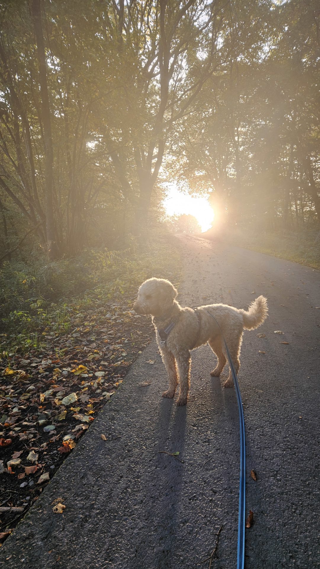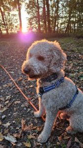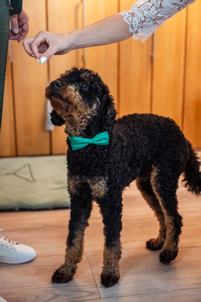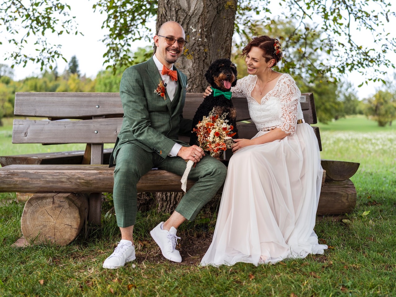 Uns allen geht es gut, Momo ist super in unserem Alltag integriert. Er liebt es mit uns zu kuscheln und zu spielen, aber er kann auch gut entspannen und bei Bedarf alleine bleiben. Das muss er aber sehr selten, wenn wir mal ohne ihn unterwegs sind, ist er sehr gerne bei meinen Eltern, auch über Nacht bei Bedarf. Er ist überhaupt sehr umgänglich mit allen Menschen (auch Kindern) und allen Hunden (immer zum Spielen aufgelegt, bellt nie zurück wenn ein anderer Hund pöbelt). Wir haben bis zum Sommer immer noch regelmäßig die Hundeschule besucht, mal im offenen Training und zuletzt nochmal mit einem Kurs zur Leinenführigkeit (hat sich gelohnt!). Im September haben wir geheiratet und Momo war natürlich mit dabei – ein paar Fotos schicke ich mit. Jetzt über den Herbst/Winter wollen wir ein bisschen Tricktraining mit Momo machen, daran hat er bisher Spaß und wir können uns gut gemeinsam drinnen beschäftigen. Er wiegt jetzt übrigens 13 kg ziemlich konstant schon seit einigen Monaten. Die Hormone spielen manchmal noch ein bisschen verrückt, aber das ist schon wieder besser geworden.