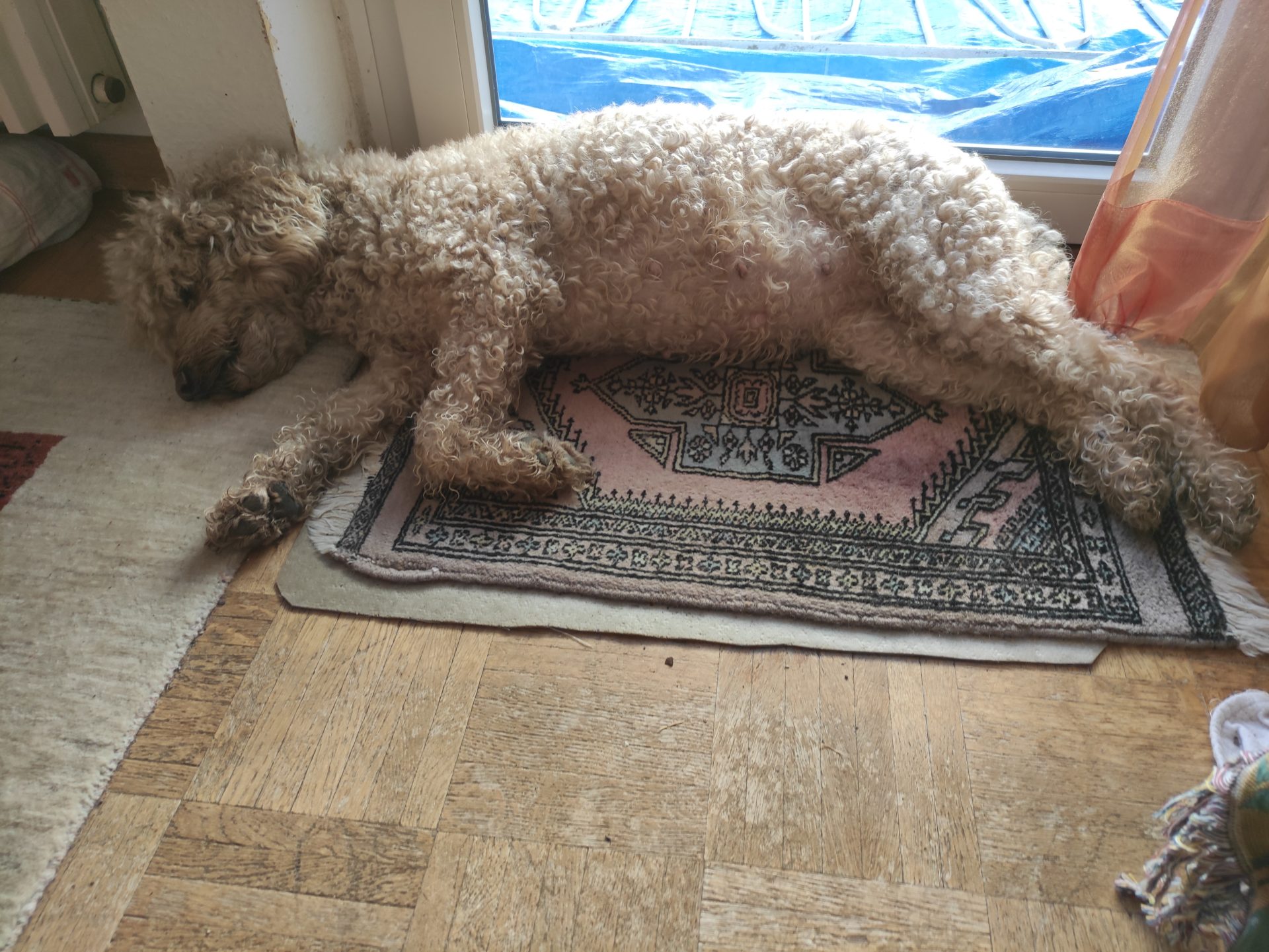 Camilla hat ihre festen Plätze. Tagsüber liegt sie gerne vor der Balkontür damit sie alles im Blick hat (oder im Ohr :), abends liegt sie meistens auf ihrem Sessel vor dem Ofen und nachts liegt sie auf einer Matte im Schlafzimmer, die an dem Ort liegt, wo später die Wurfbox aufgestellt wird.