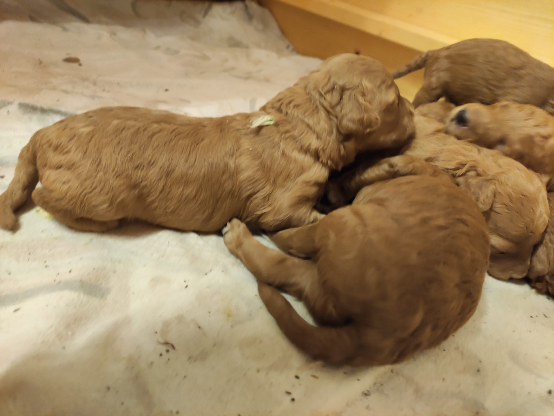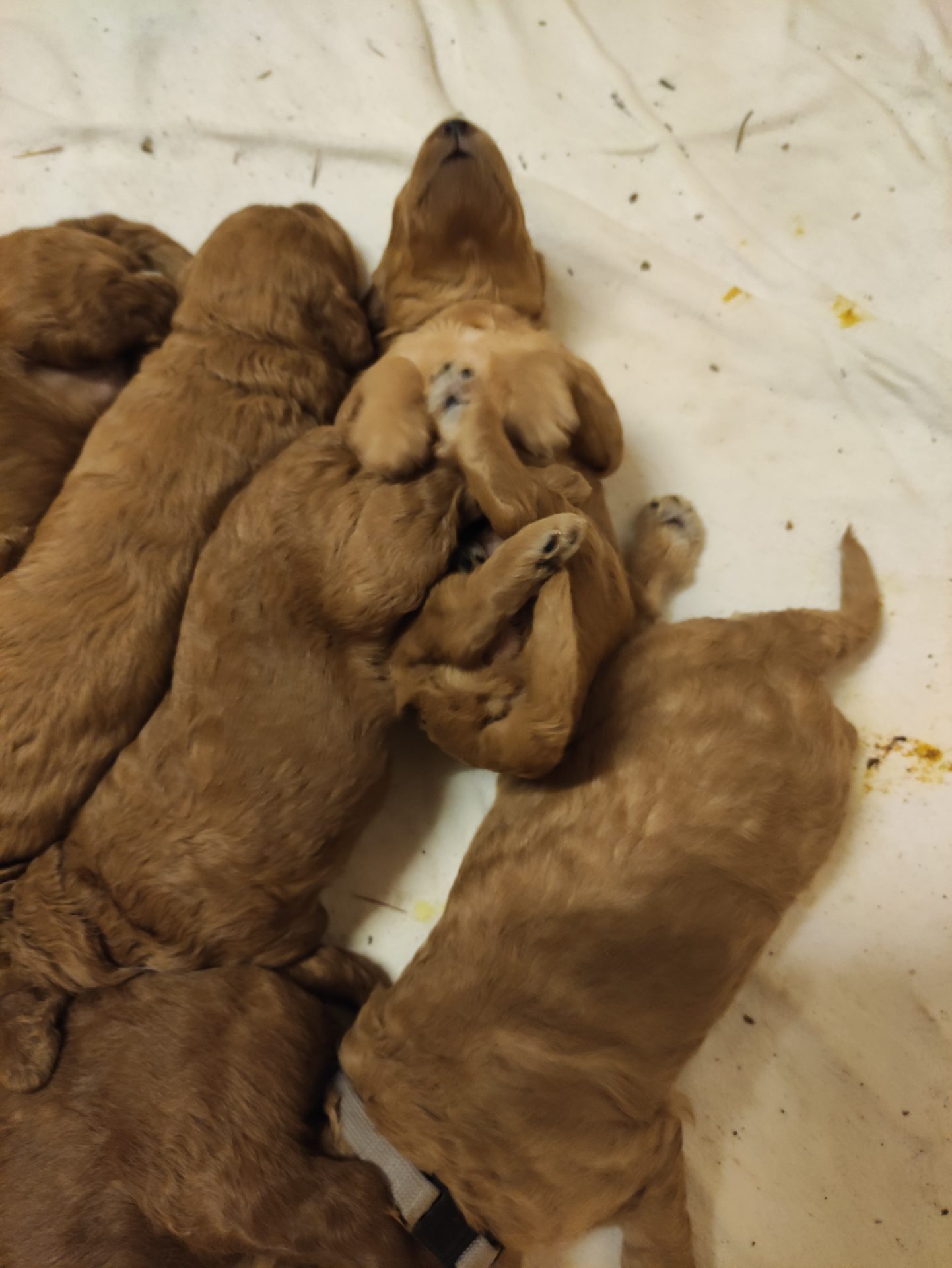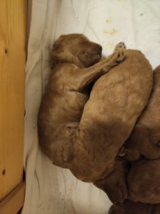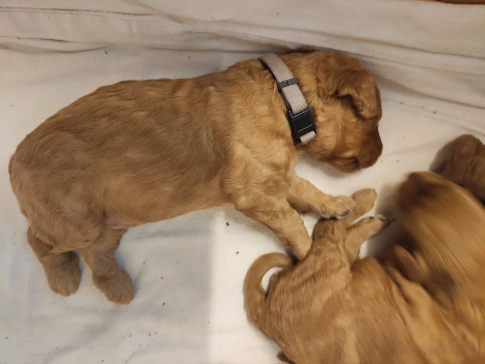 Hier räkelt sich das Mädchen mit dem roten Halsband. Sie ist mit Abstand die kleinste im Wurf.