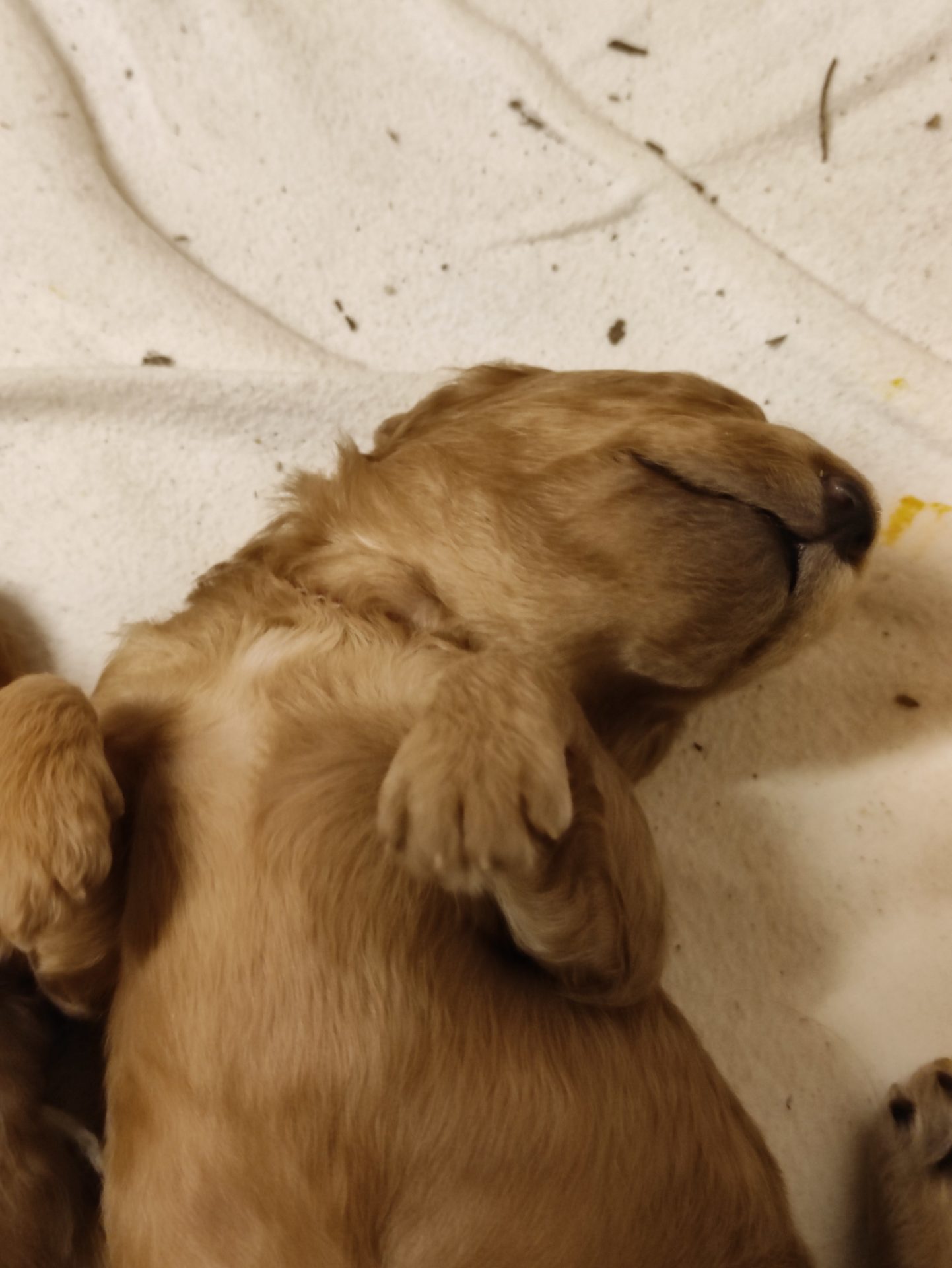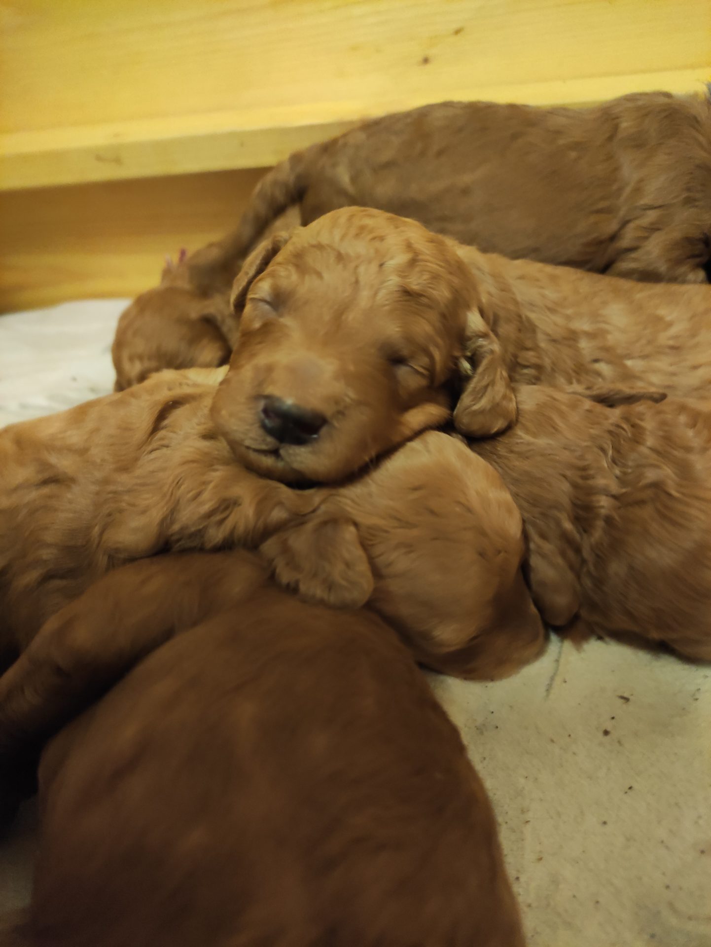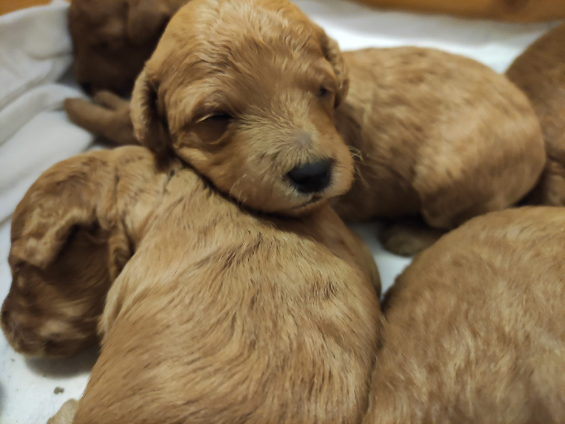 Hier räkelt sich das Mädchen mit dem roten Halsband. Sie ist mit Abstand die kleinste im Wurf.