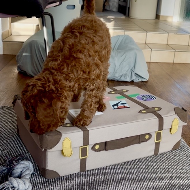 Pepi hat ein Faible für Waschanleitungen und kaut am liebsten die Etiketten. Sein favorisiertes Spielzeug ist der IKEA-Kinderkoffer, den er mittlerweile auch alleine öffnet. Manchmal legt er sich einfach rein, und es stört ihn auch überhaupt nicht, wenn der Deckel dann ein Stückchen runterklappt. Und er liebt seinen Kong-Reifen, den er, sobald alle Leckerchen raus sind, noch durch das Handtuch fädelt – diesen Spaß hat er sich selbst ausgedacht.