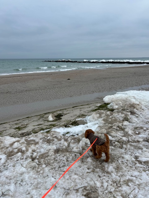 Heute war endlich Strandpremiere mit Eisschollen – siehe Foto anbei. Das Meeresrauschen war ihm erst ein bisschen suspekt, dann tapste er aber schon ein bisschen im Wasser.